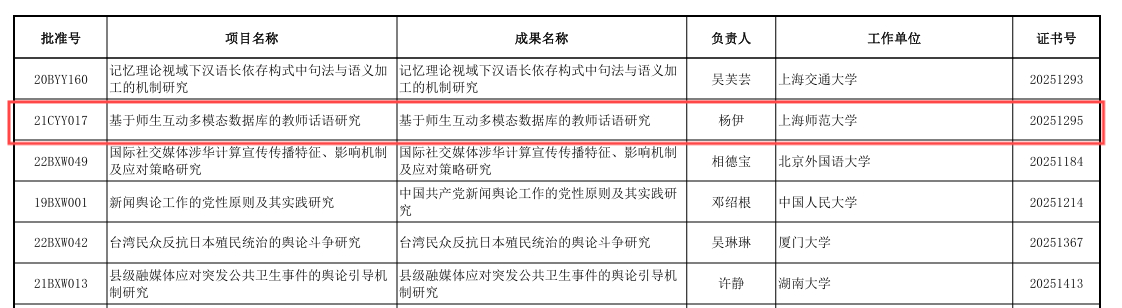 2025年4月24日,全国哲学社会科学工作办公室公布《2025年4月国家社科基金年度项目结项情况》。我院教育学系杨伊副教授主持的国家社科基金青年项目“基于师生互动多模态数据库的教师话语研究”(批准号:21CYY017)顺利通过结项验收,获评“优秀”等级。在本次结项中,全国共验收481个年度项目,其中仅有55个项目获此殊荣。
