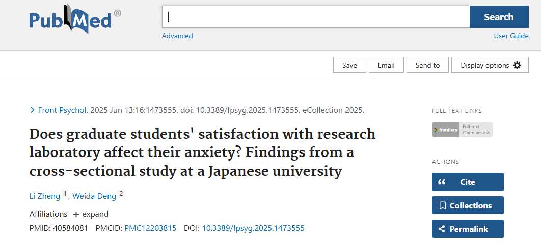 2025年5月,郑力在高水平期刊Frontiers in Psychology(SSCI一区,影响因子2.9)发表题为“Does Graduate Students’ Satisfaction with Research Laboratory Affect Their Anxiety? Findings from a Cross-Sectional Study at a Japanese University”的研究论文,郑力为第一作者。该研究聚焦研究生心理健康,揭示了实验室满意度对焦虑水平的影响机制。研究指出,良好的实验室环境与积极的科研成果体验能够有效缓解研究生焦虑水平,而过度依赖同伴咨询可能反而加剧焦虑。这一发现为优化研究生教育环境、促进心理健康提供了实证依据。