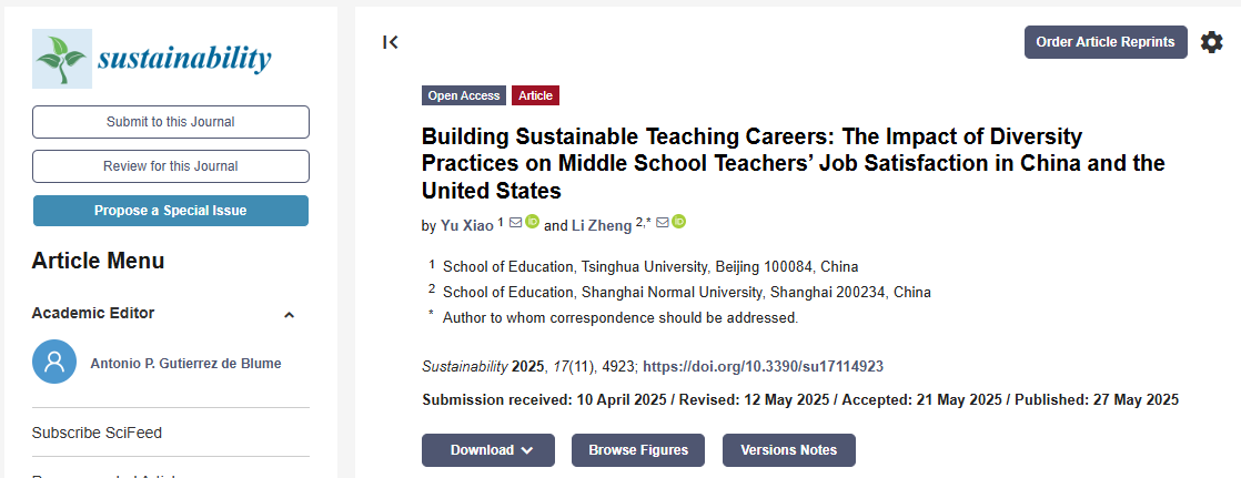 同月,郑力以通讯作者身份在权威期刊Sustainability(影响因子3.3)发表题为“Building Sustainable Teaching Careers: The Impact of Diversity Practices on Middle School Teachers’ Job Satisfaction in China and the United States”的论文。基于工作要求-资源(JD-R)理论,研究比较分析了中美两国中学教师职业满意度的影响因素。结果显示,多元化实践在美国通过结构性支持提升教师满意度,在中国则主要通过良好的师生关系发挥作用。研究强调文化响应性政策的重要性,为不同教育背景下教师队伍建设与教育公平提供了理论参考。