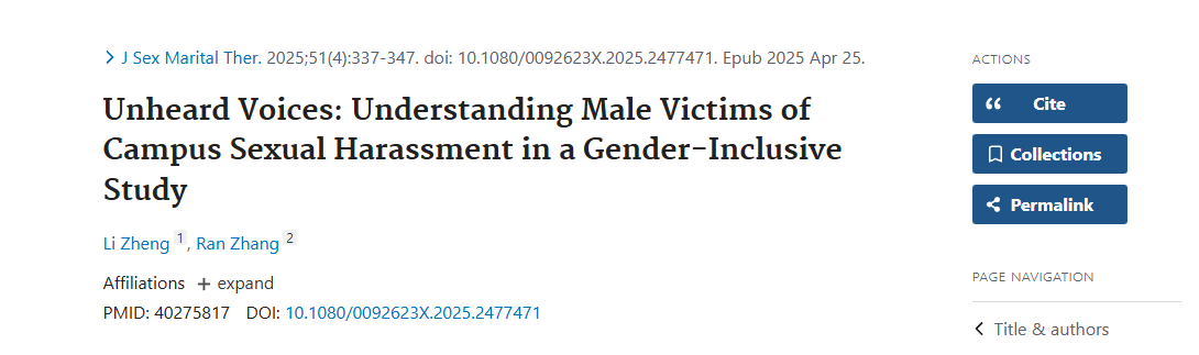 2025年4月,郑力以第一作者身份在人类性学领域权威期刊Journal of Sex & Marital Therapy(SSCI一区,影响因子2.5)发表题为“Unheard Voices: Understanding Male Victims of Campus Sexual Harassment in a Gender-Inclusive Study”的研究论文。该研究基于实证调查,深入探讨了男性校园性骚扰受害者的特征与遭遇,发现男性与女性受害比例差异不大,且男性受害者更可能与骚扰者存在较高熟悉度,同时面临更严重的学业、社交和心理负面影响。研究呼吁高校在性骚扰防治工作中更加关注男性受害群体,推动性别包容与差异化支持策略。